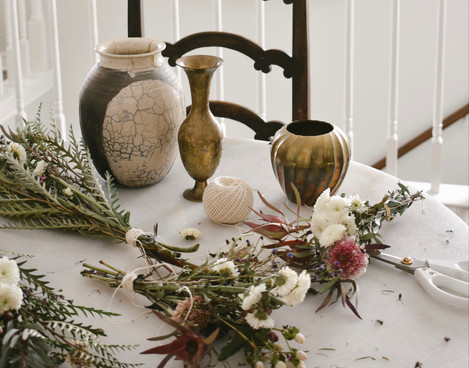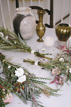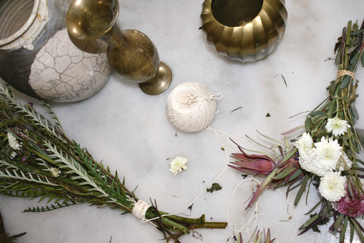 Take your florals and create smaller bundles. I treated these like mini bouquets and used a variety of greenery and flowers in each bundle. Once I had the bundle created I would then wrap the end of the stems together with a rubber band. The stems will shrink as they dry so make sure to get your rubber band as tight as possible!